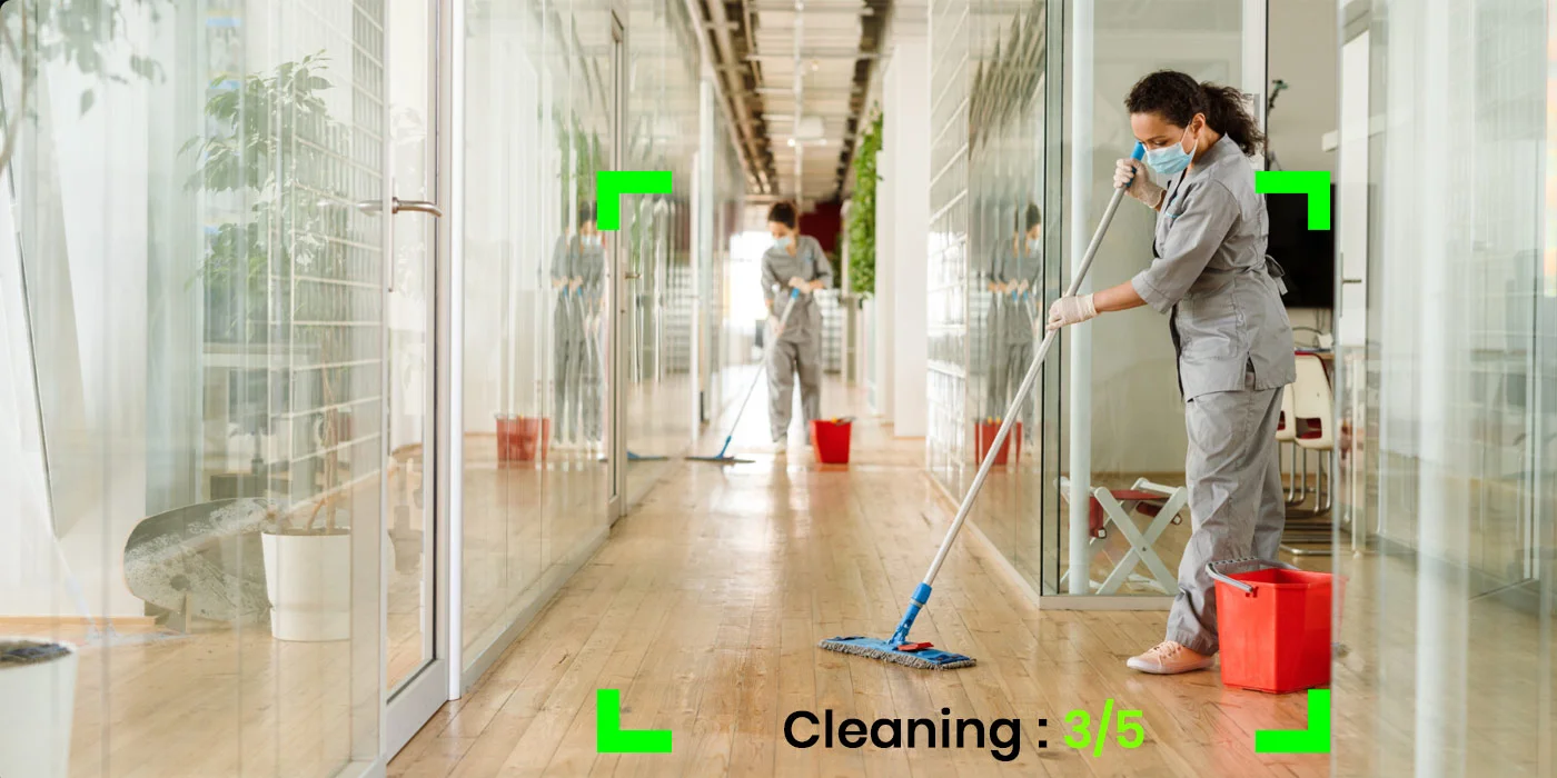 Marwiz Vision’s AI analytics continuously monitor designated zones to verify if cleaning activities are performed as per schedule. The system identifies cleaning staff presence, activity completion, and timestamps, ensuring timely and consistent maintenance.